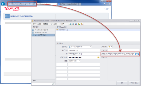 Webサイトのログイン画面をブラウザで開いてアドレスを登録画面の「アドレス」の項目へ コピーするだけ。あとはIDとパスワードを設定して完了です。
