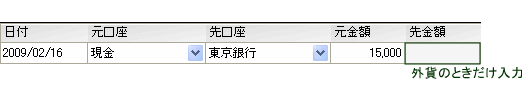 入力表の[口座間移動]タブを開いて移動元の口座と移動先の口座を選択してください。