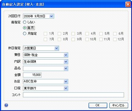 自動記入は毎月、決まった金額の記入を自動化する機能です。
