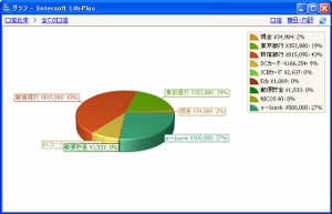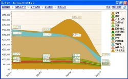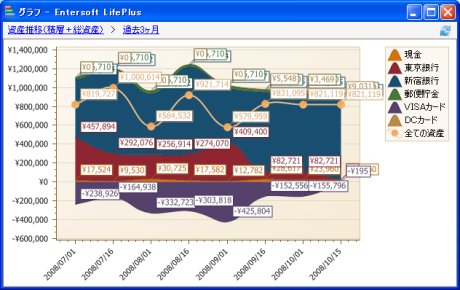 各口座残高と積み上げた残高合計と負債分を差し引いた合計をスプライングラフにより一目で確認できます。