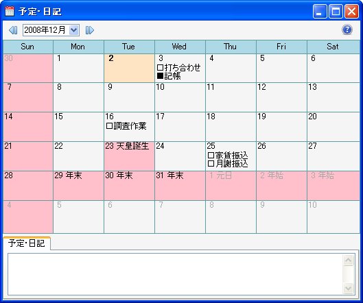予定・日記  - | 予定・日記の表示 | 休日の設定 |